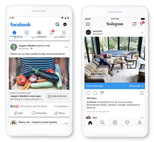 Bei Click-to-WhatsApp-Werbung kannst du deinen Anzeigen auf Facebook oder Instagram einen Button „Nachricht senden“ hinzufügen, der eine Unterhaltung in WhatsApp öffnet. So können Kund:innen mit einem Klick auf den Button in deiner Anzeige einen WhatsApp-Chat mit deinem Unternehmen starten.