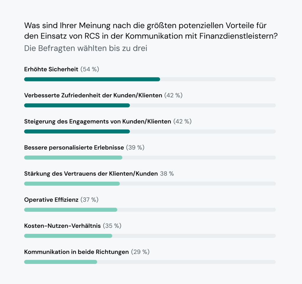 Verbesserte Sicherheit (54 %) steht an der Spitze der Liste der potenziellen Vorteile von RCS bei Finanzdienstleistungen. Es folgen eine höhere Kundenzufriedenheit (42 %) und ein stärkeres Engagement (42 %).