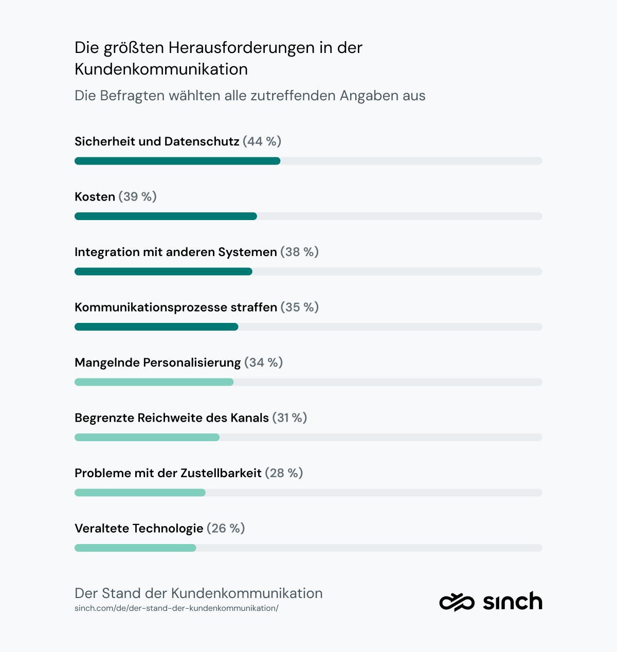 Abgesehen von diesen drei größten Herausforderungen ist klar, dass Unternehmen mit einer Vielzahl von Problemen in der Kundenkommunikation konfrontiert sind. Jede in unserer Umfrage vorgestellte Herausforderung wurde in mehr als 25 % der Fälle gewählt. Das bedeutet, dass eines von vier Unternehmen mit mindestens einer dieser Herausforderungen konfrontiert ist.