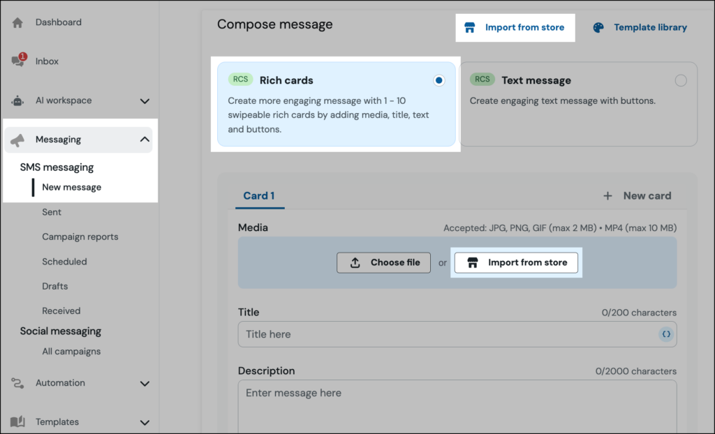 - Start an RCS Campaign: In the “Compose message” section of a new RCS campaign, select the Rich cards option.