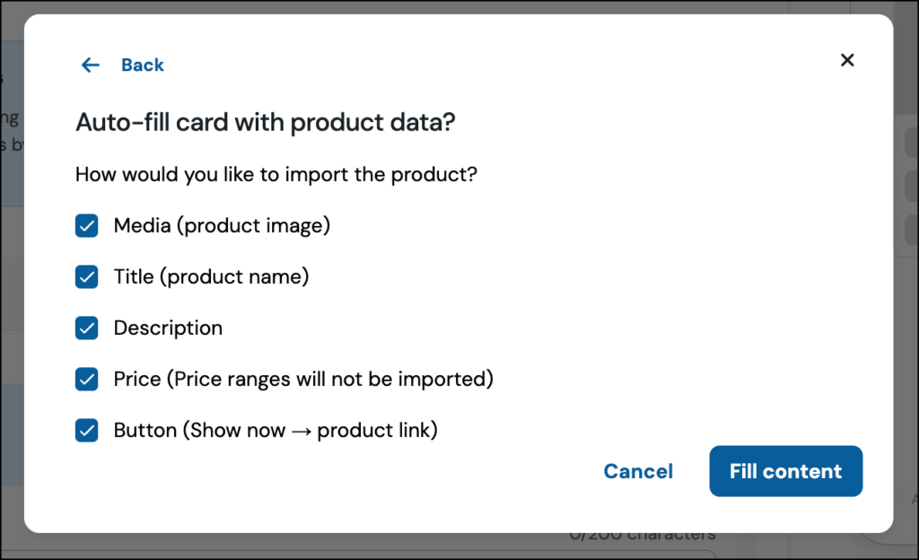 You can choose a single item or select multiple products to build a carousel. The integration automatically pulls in the product name, description, image, price, and a direct “shop now” link, populating the rich cards for you.
