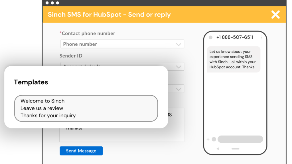 Just like email templates, SMS templates are key to working smarter. With Sinch Engage’s HubSpot SMS integration, it’s easy to either create your own branded SMS templates or select one of our ready-to-go templates. Just use the different fields to customize your message with names, dates, and other personal information.