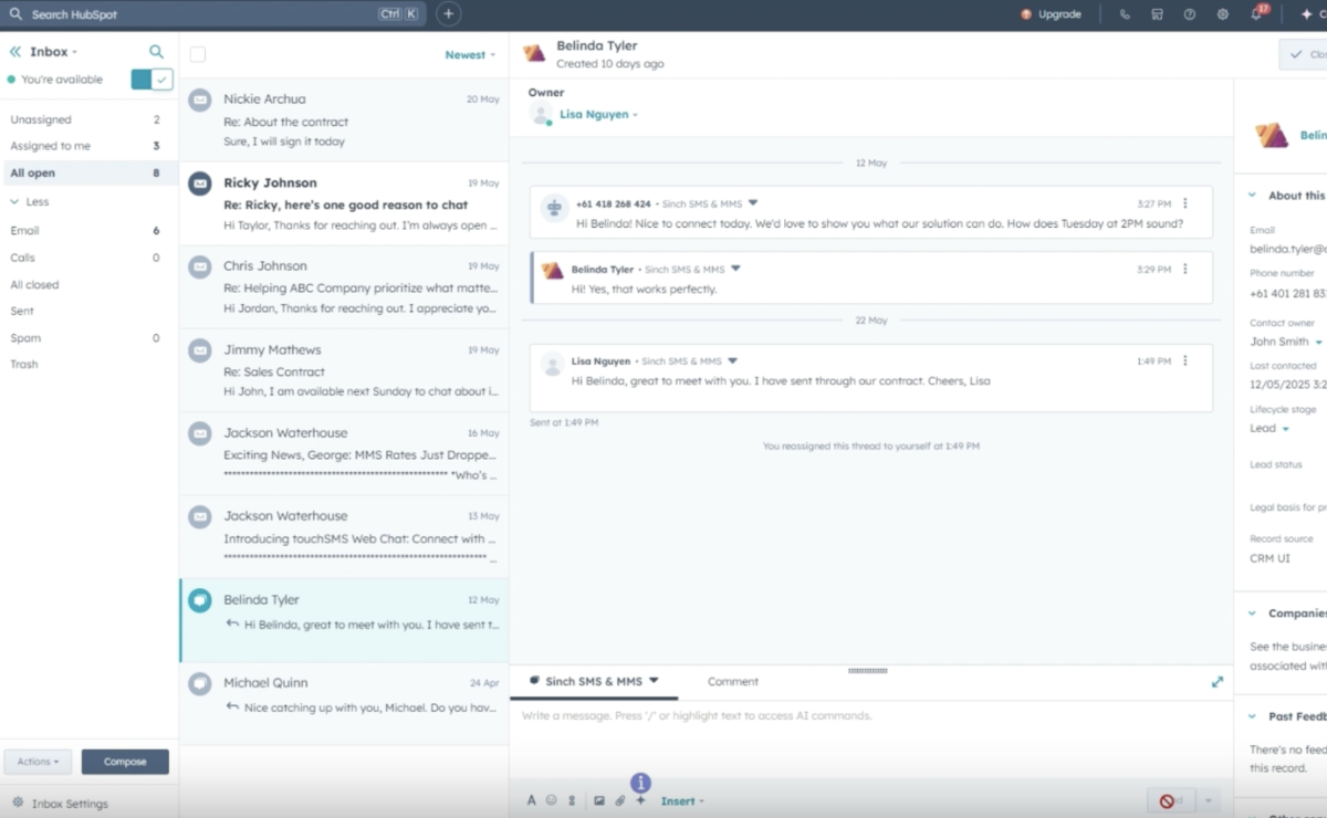 - Time-to-first-response on inbound texts. Sinch Engage feeds responses into HubSpot so you can measure how fast your team replies (as well as how that response time impacts overall conversions).