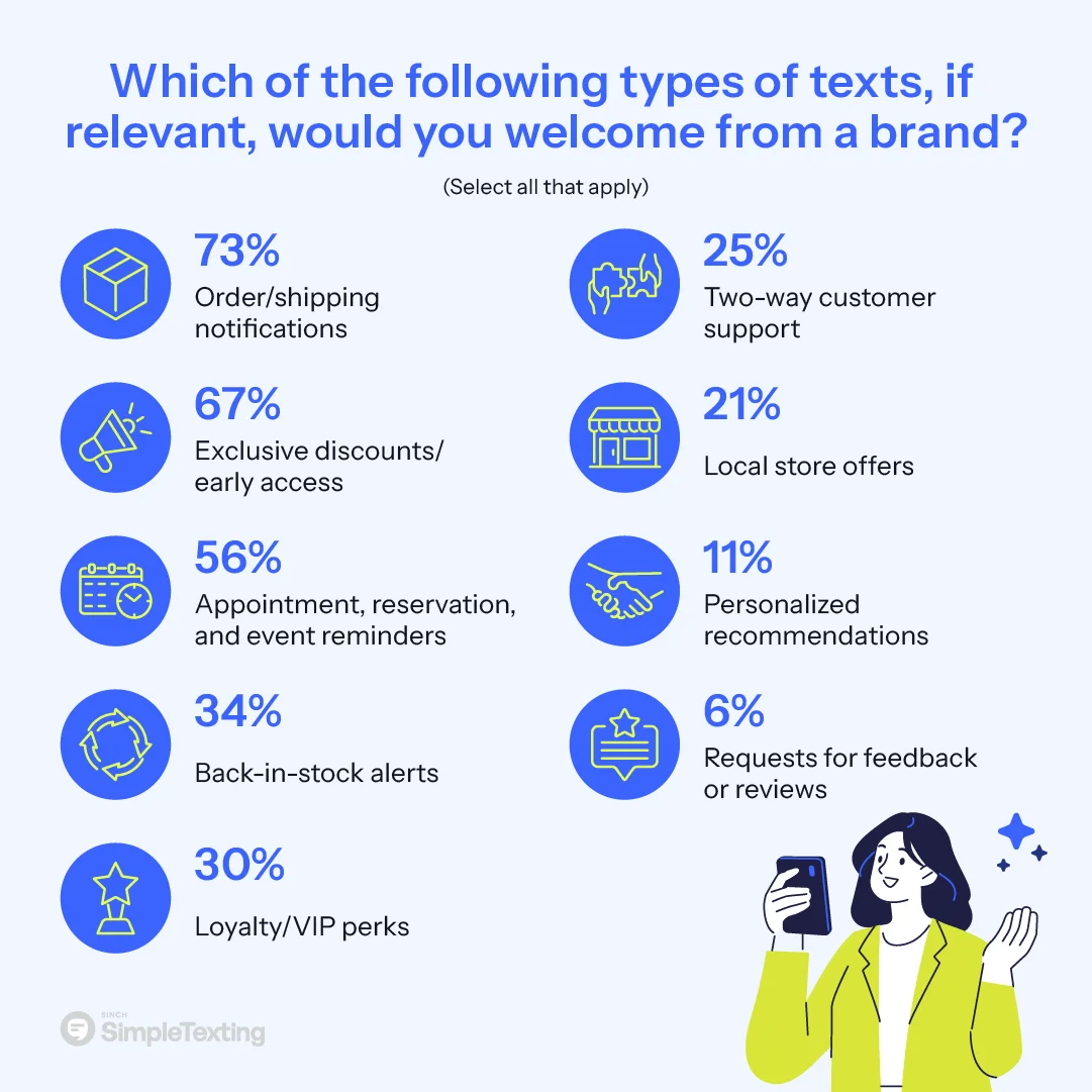 Not all messages are created equal. Given the many types of messages, offers, and information your business may be tempted to send through a text message, know that some are more welcomed than others.