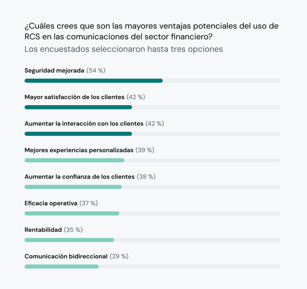 La mejora de la seguridad (54 %) encabeza la lista de posibles ventajas de RCS en los servicios financieros. Le siguen la mejora de la satisfacción del cliente (42 %) y el aumento de las interacciones (42 %).