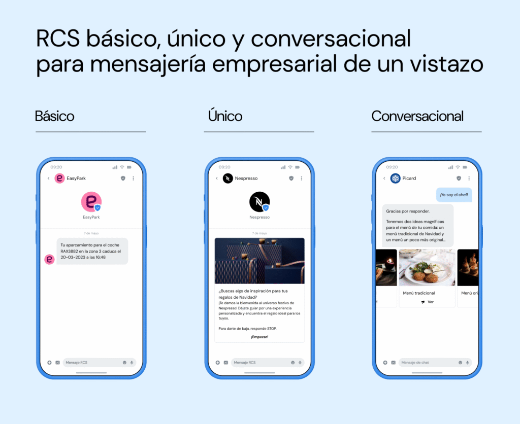 Dentro del universo RCS existen tres tipos diferentes de mensajes: mensajes RCS básicos, únicos y conversacionales.