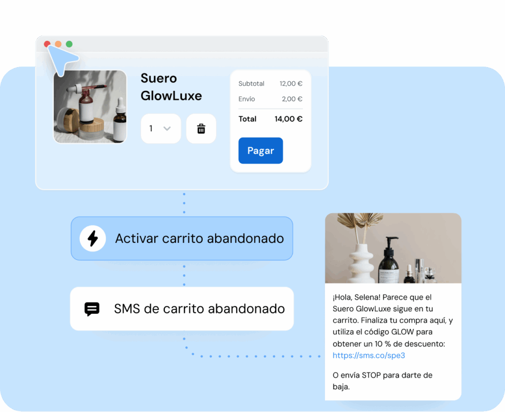 Estas integraciones te ayudan a recuperar carritos abandonados, añadir flujos de trabajo automatizados por SMS y crear campañas promocionales personalizadas.