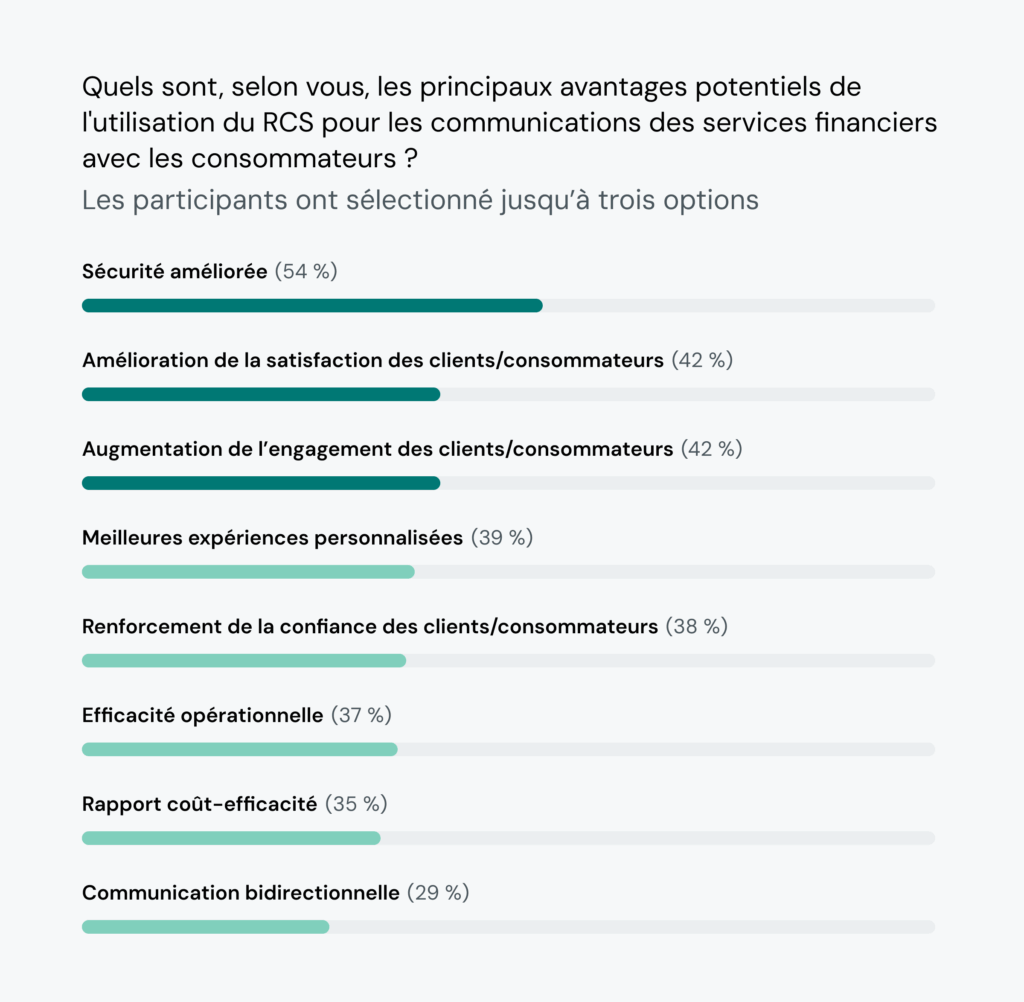 L’amélioration de la sécurité (54 %) arrive en tête de la liste des avantages potentiels du RCS dans les services financiers. Viennent ensuite l’amélioration de la satisfaction des clients (42 %) et l’augmentation de l’engagement (42 %).